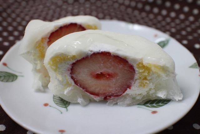 と思って食べようとしたら、触ってびっくり。ふにゃんと柔らかい。赤ちゃんの耳たぶみたいな滑らかで心地よい牛皮の中にイチゴとホイップ、スポンジが入ってる。